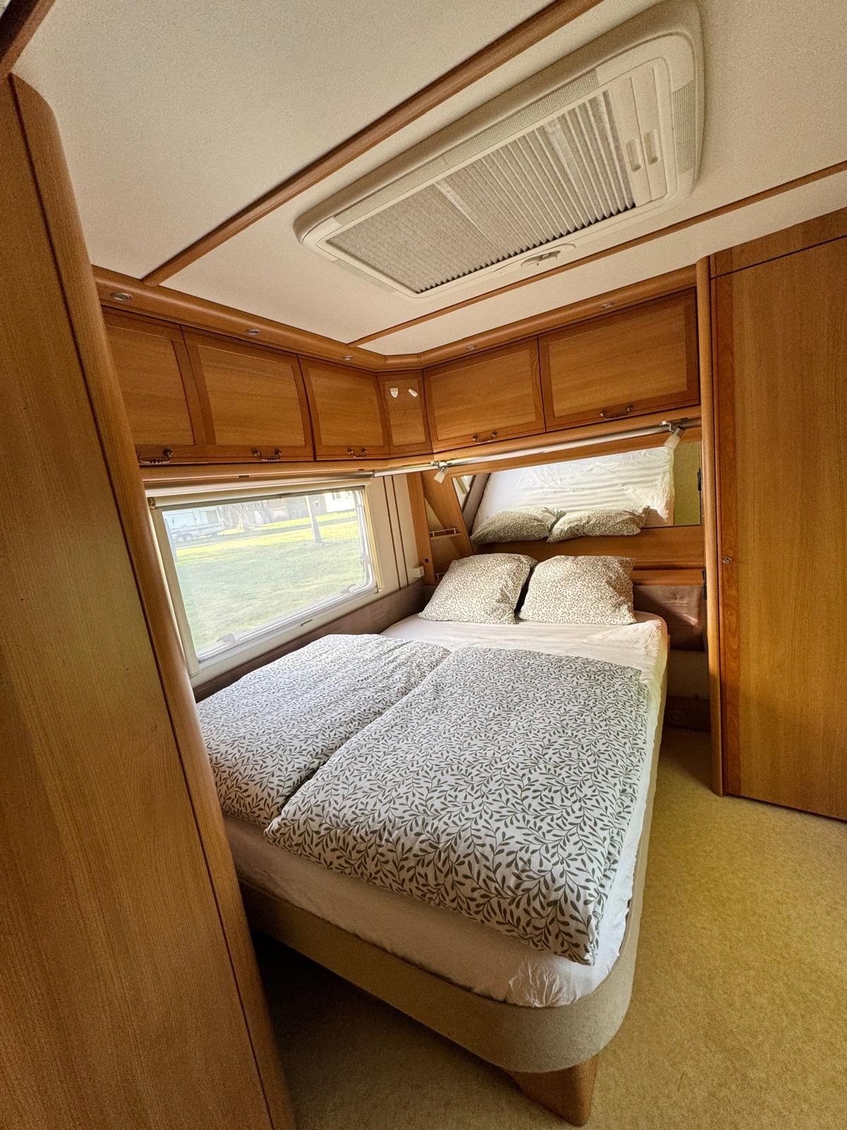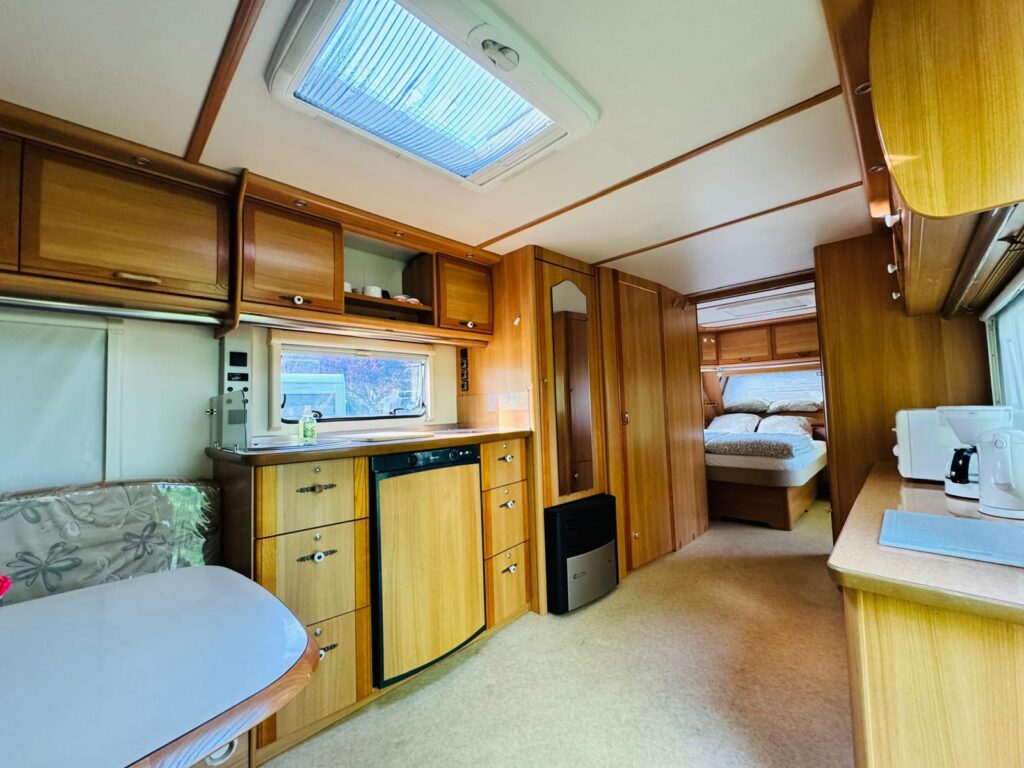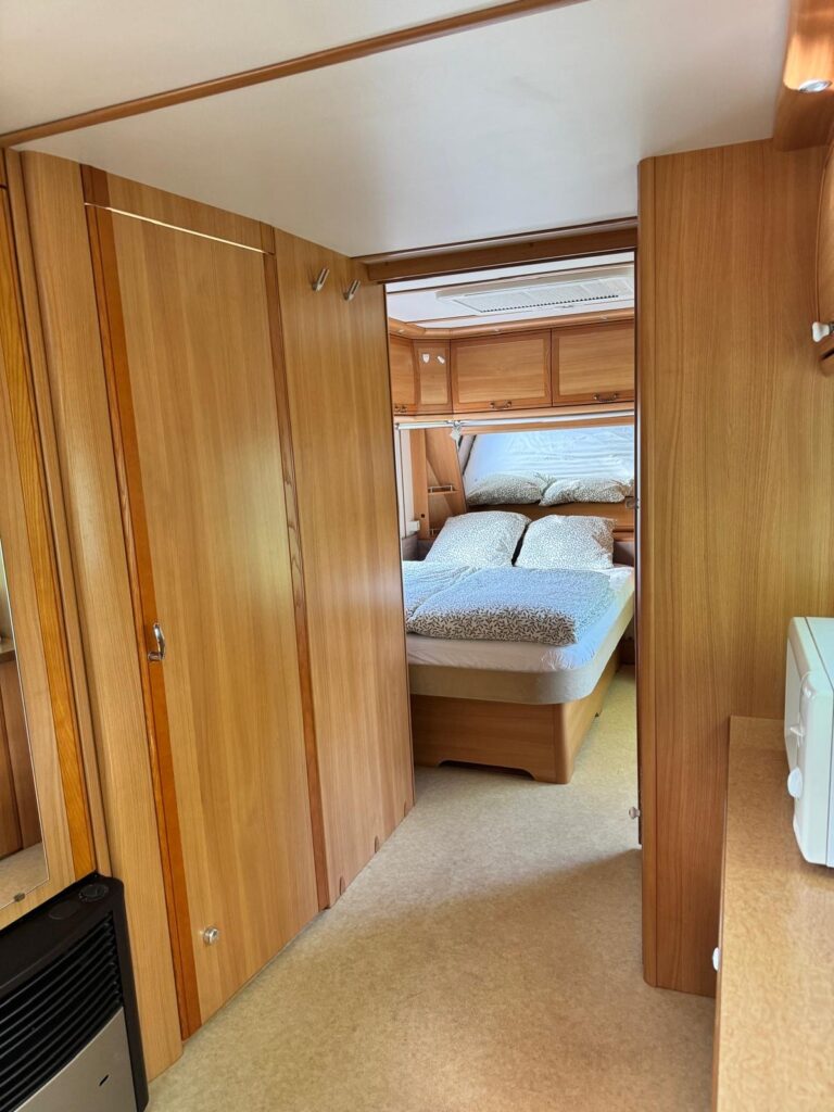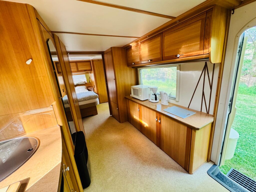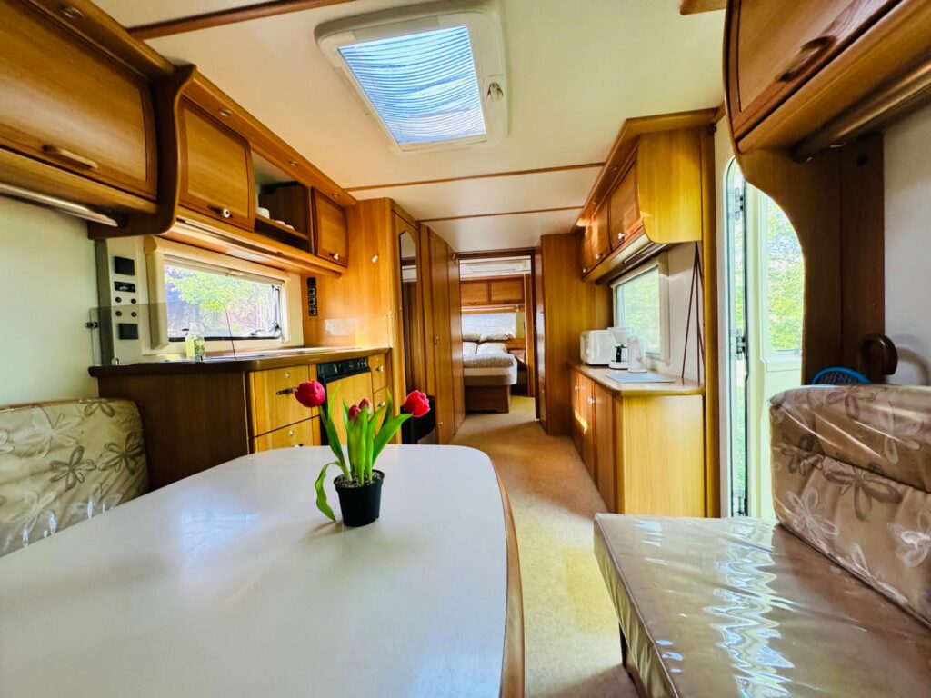La caravane est entièrement équipée. Le séjour comprend une cuisine avec plaque de cuisson à gaz 3 feux, réfrigérateur, cafetière, micro-ondes et vaisselle. Il y a également un coin salon spacieux avec table. La chambre dispose d’un lit double (190 x 140 cm) avec couettes et oreillers individuels.