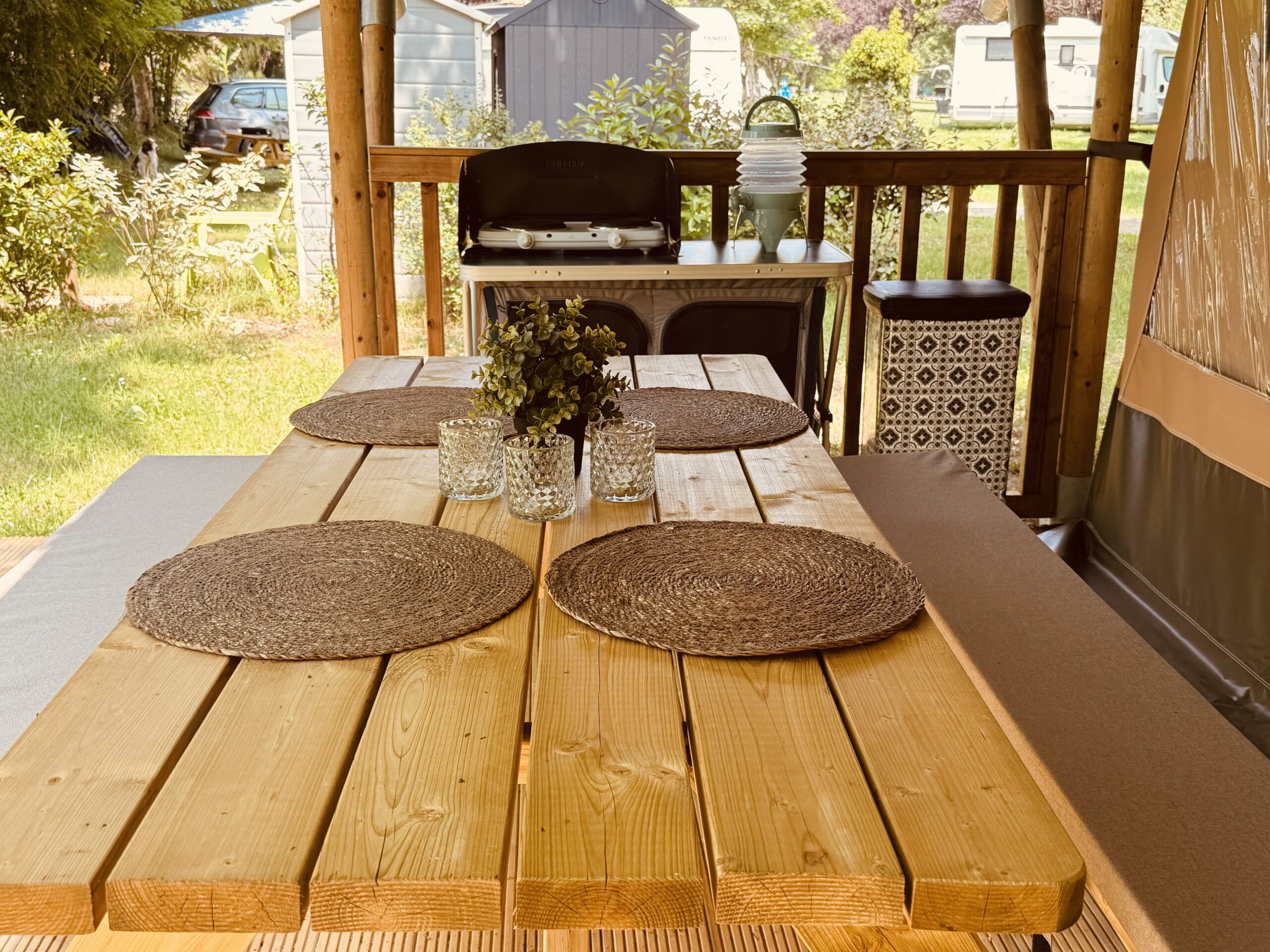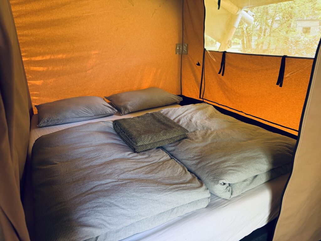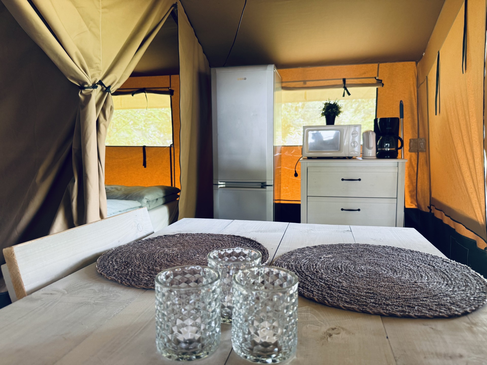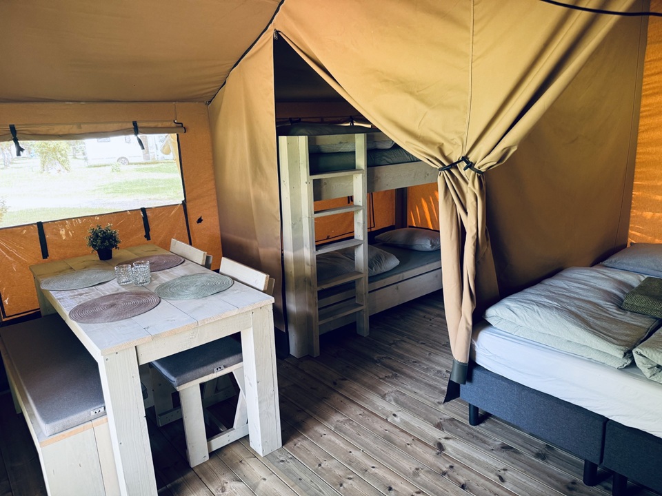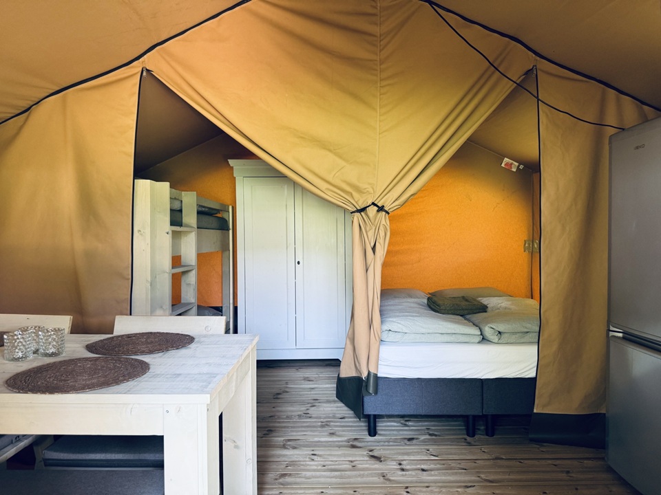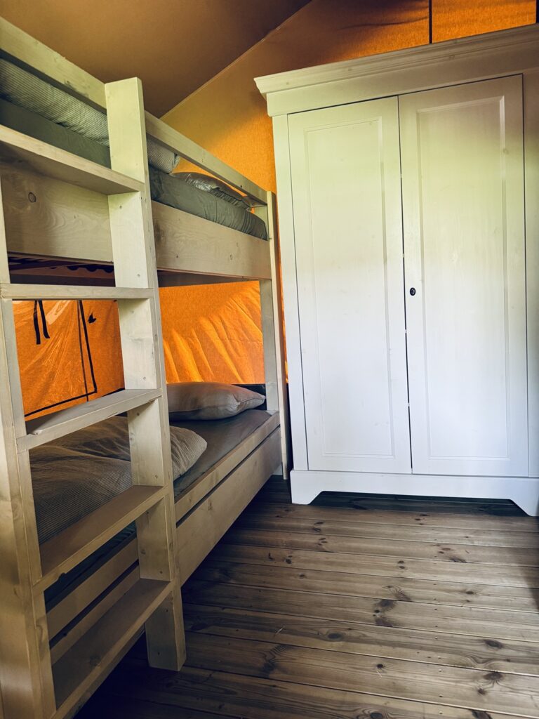 Das Safarizelt verfügt über eine große, überdachte Terrasse mit Bank und Picknicktisch. Eine Küche mit Essecke und 2 Schlafzimmern: eines mit einem Doppelbett (200 x 140 cm) und eines mit einem Etagenbett (2 × 200 x 80 cm). Die Küche ist mit einem 2-flammigen Kochfeld, Kühlschrank, Kaffeemaschine und Geschirr für 4 Personen ausgestattet. Der Essbereich verfügt über einen Tisch, eine Bank und zwei Stühle. Die Betten sind mit Einzelbettdecken und Kissen ausgestattet. Eine Trockentoilette mit Zubehör ist auf dem Stellplatz vorhanden. Sie sind verpflichtet, die Trockentoilette selbst zu entleeren und zu reinigen.