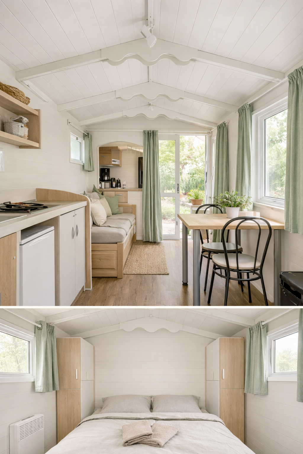 The living area includes a kitchen, dining table with chairs, and a sofa. The kitchen is equipped with a 2-burner gas hob, refrigerator, coffee maker, microwave and tableware.