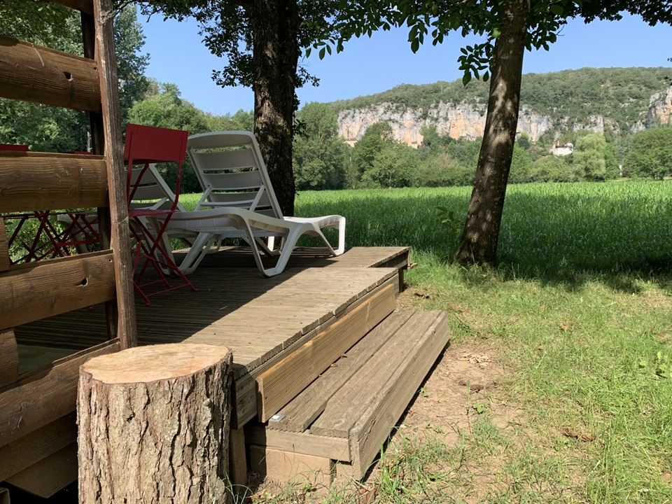 The 21 m² roulotte offers a very enjoyable holiday experience. Enjoy panoramic views of the valley, the rocky cliffs and the Célé River, where you can hear the soothing sounds of the water and cool off wonderfully. Camping Le Célé is a cosy, small family campsite. The sanitary facilities are located a short distance away. Perfect for a relaxing stay in the heart of nature.