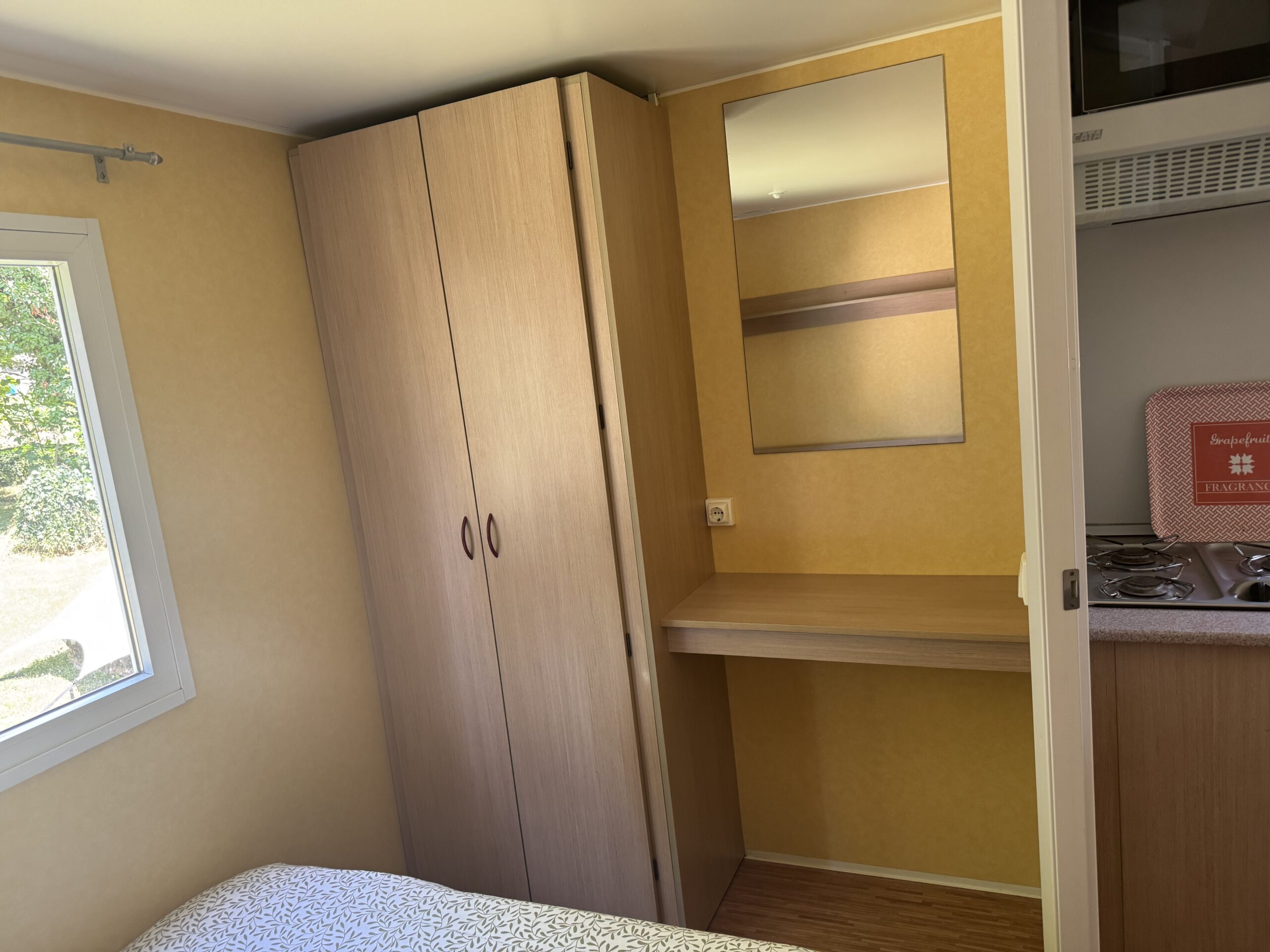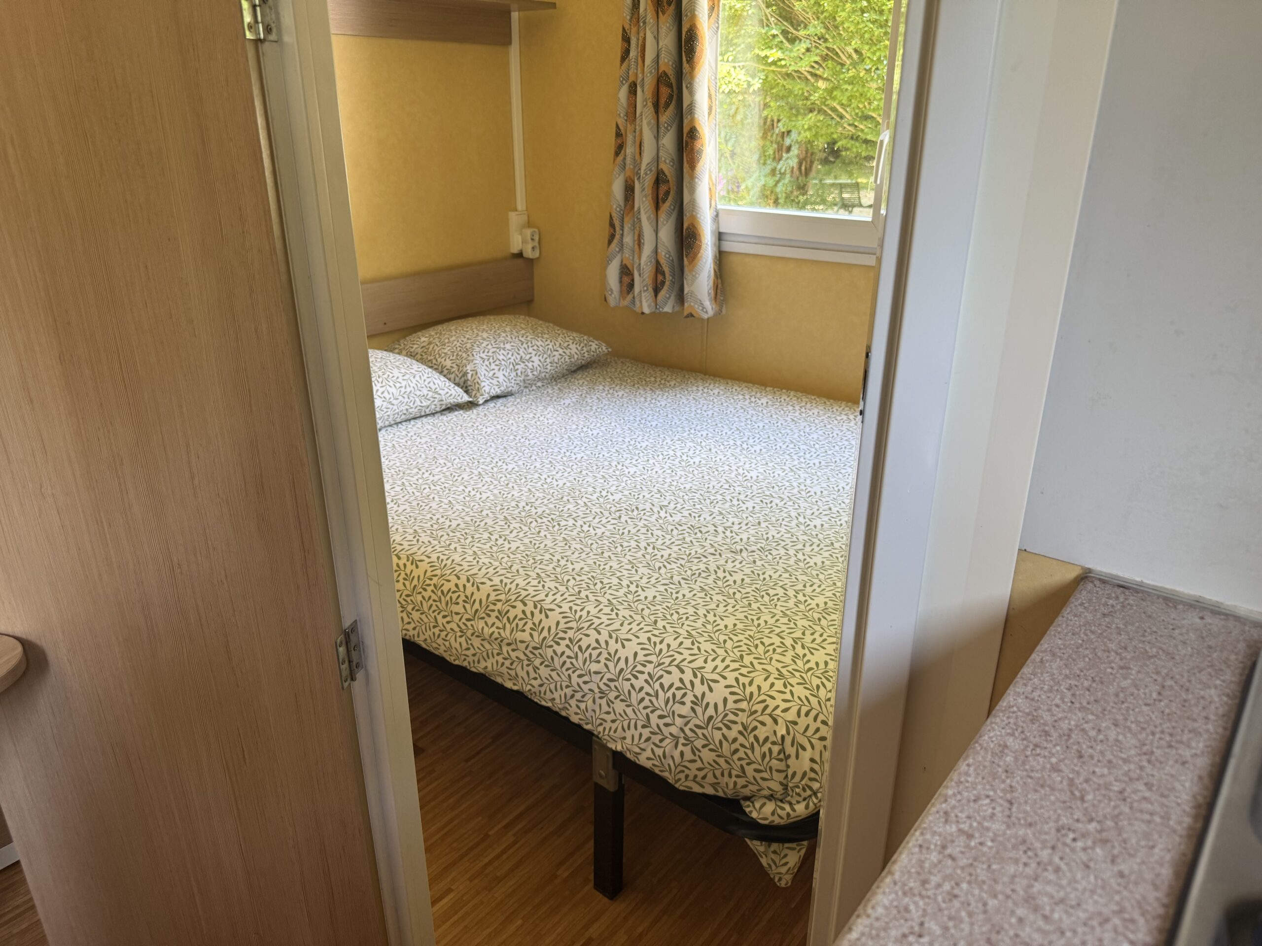 De living heeft een eethoek met keuken. Er zijn 2 slaapkamers met een tweepersoonsbed (200 x 140cm) en 2 losse bedden (2 x 200 x 80cm). De bedden zijn voorzien van 1 persoons dekbedden en kussens. Lakenpakket inbegrepen. De keuken is voorzien van een 2-pits kookpit, koelkast, koffiezetapparaat, magnetron en serviesgoed. De Mobilehome beschikt over een vlonder voorzien van een tafel, 4 stoelen en parasol.
